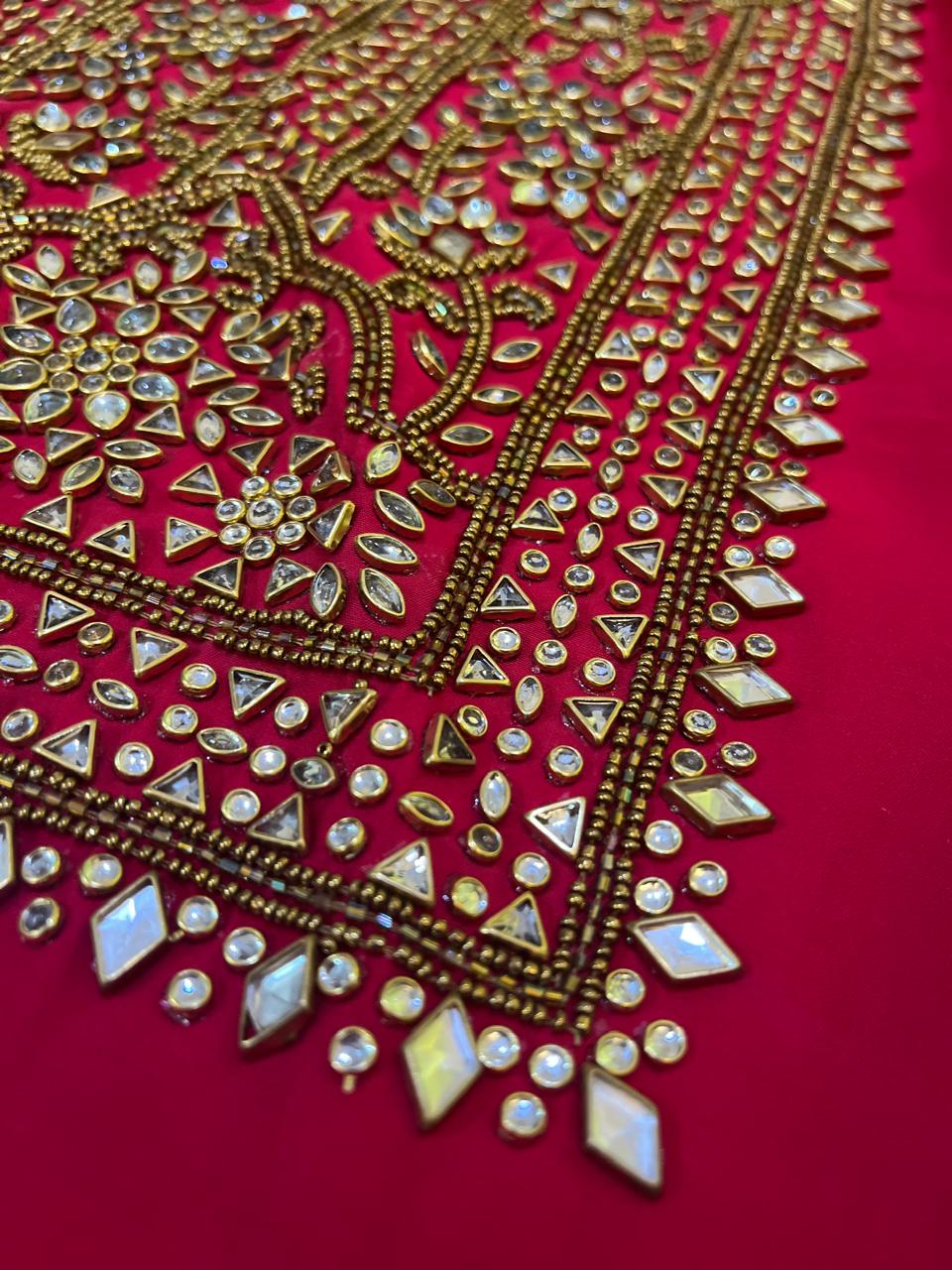 Very intricate and beautiful hand work Kurta. Lovely work on the neck and work at sleeves. Kundan work and overall embroidery is just stunning and classy. Ideal for party wear. This one is a lovely shade of Raspberry Red. The fabric of the kurta is soft muslin.