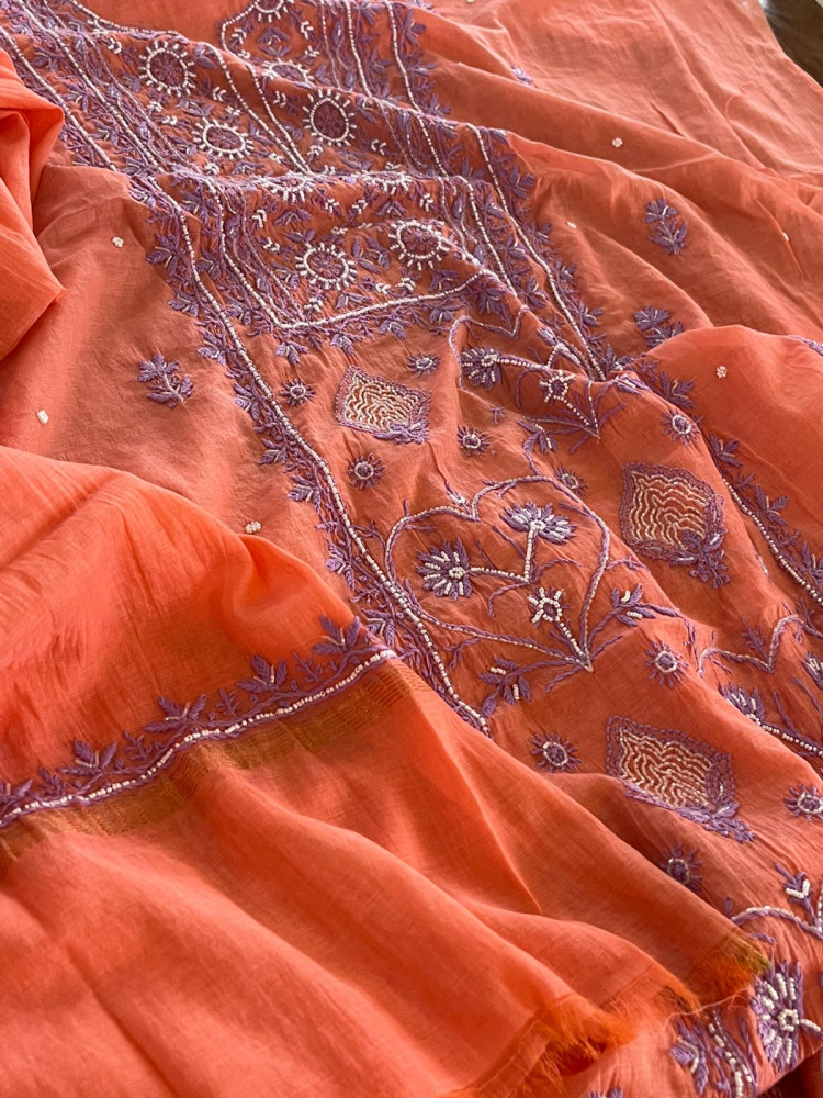 A graceful Mul Chanderi Kurta Dupatta set in a soothing coral tone, adorned with delicate pearl and sequin embellishments. The soft mul fabric enhances comfort while retaining the subtle sheen of Chanderi, giving it an elegant drape. It is a lovely shade of Coral.