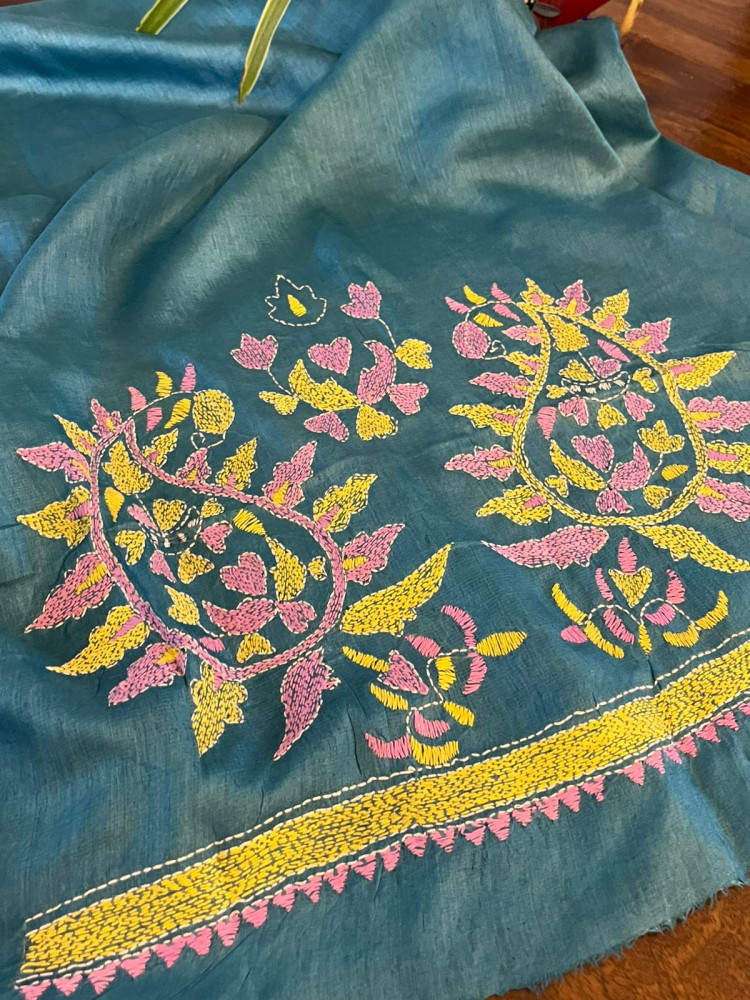 Pure Silk Kantha Hand embroidered blouse. The fabric of the blouse is pure Tussar Silk. Very elegant and beautiful handcrafted ones. This one is a beautiful Teal Grey.