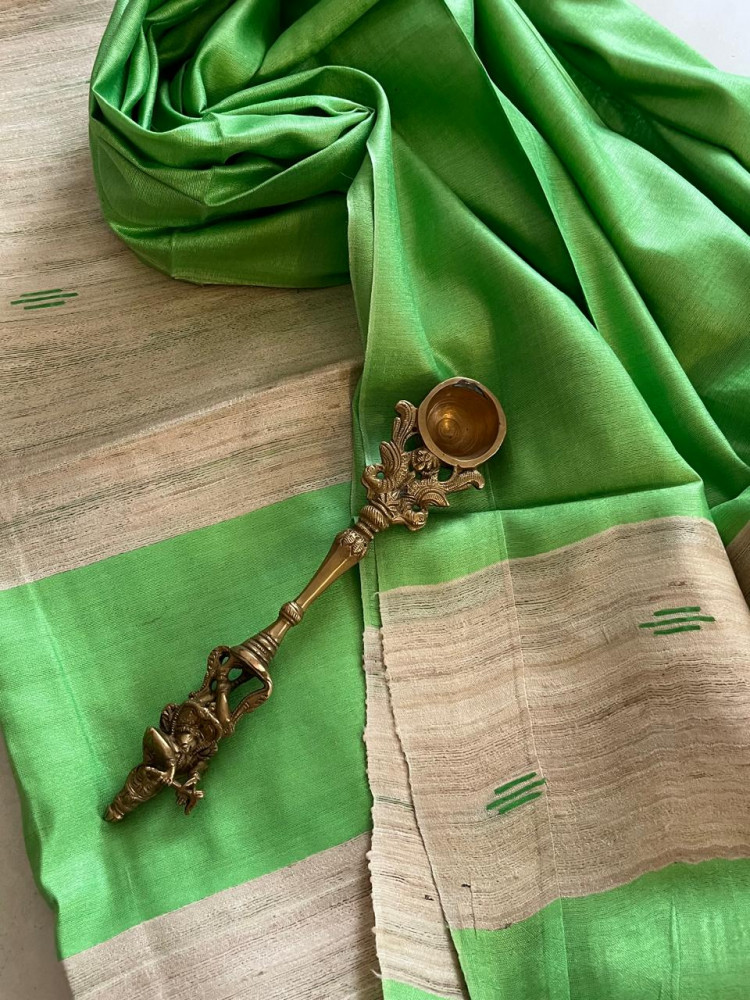 Very elegant and beautiful Pure Tussar Geecha Silk Handwoven suits in contrast shades. The kurta, Dupatta and bottom are all pure silk. They are elegant and beautiful. With woven buttis allover! The set comprises of pure silk handwoven Kurta, Dupatta and bottom. The dupatta body colour and bottom colour matches.