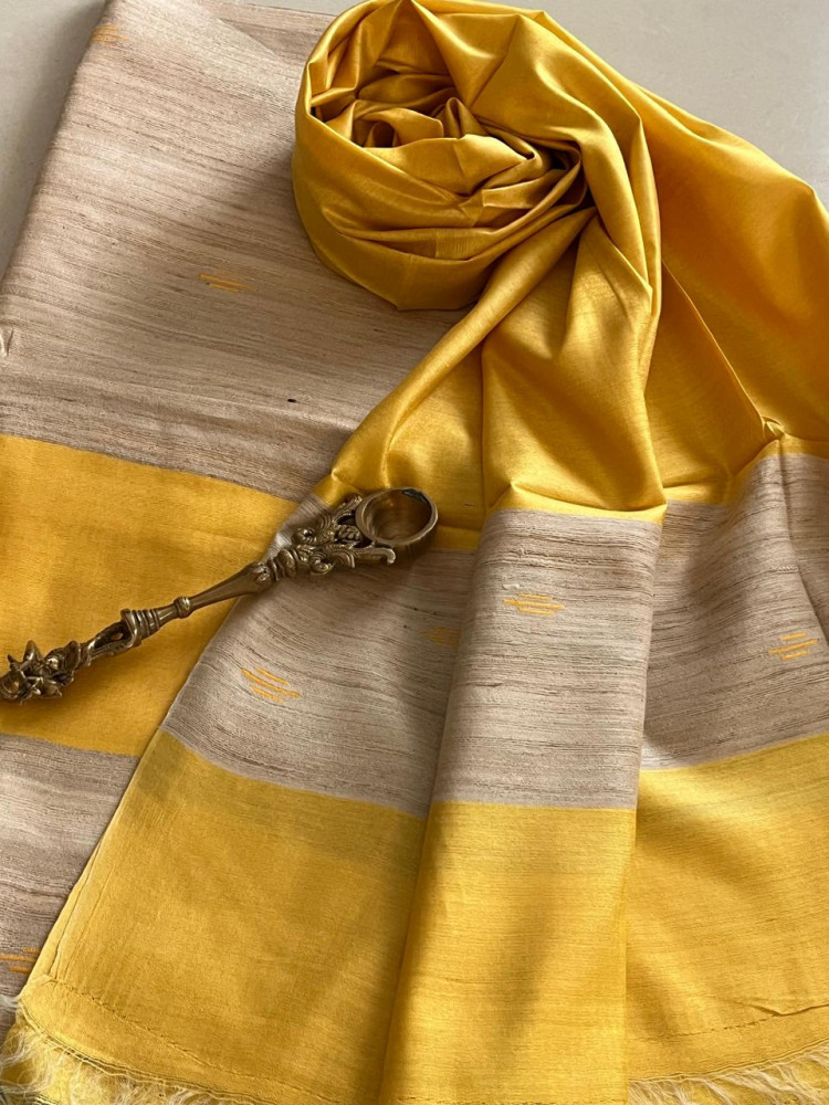Very elegant and beautiful Pure Tussar Geecha Silk Handwoven suits in contrast shades. The kurta, Dupatta and bottom are all pure silk. They are elegant and beautiful. With woven buttis allover! The set comprises of pure silk handwoven Kurta, Dupatta and bottom. The dupatta body colour and bottom colour matches. They are an ideal wear for formal occasions. Beautiful combination of Beige and Yellow.